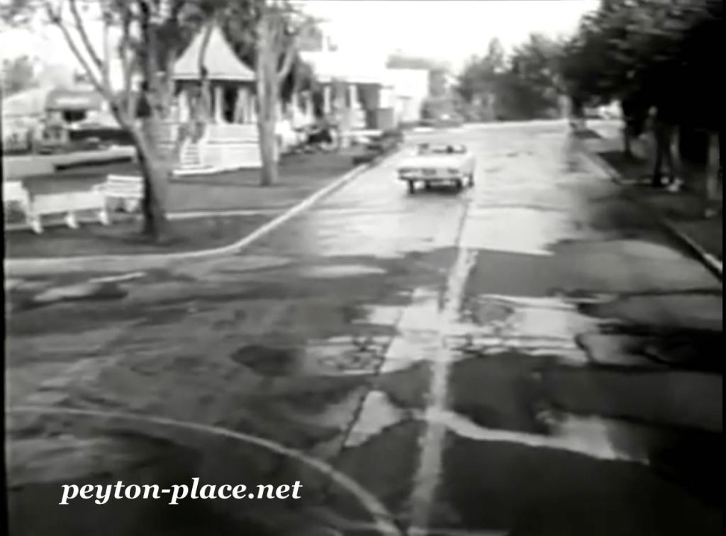 Rodney et Betty retournent à Peyton Place et se garent à l’extrémité est de la place, près du pilori, devant le bâtiment de la banque.
