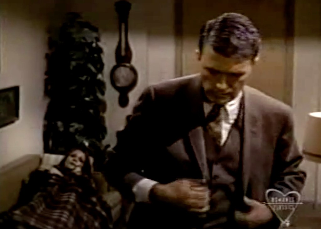 M. Burrows dépose Rachel en face de l’entrée de l’hôpital de Peyton Place. (M. Burrows à l’apparence typique du fermier des années soixante.) Rachel le remercie gracieusement et il lui souhaite bonne chance.