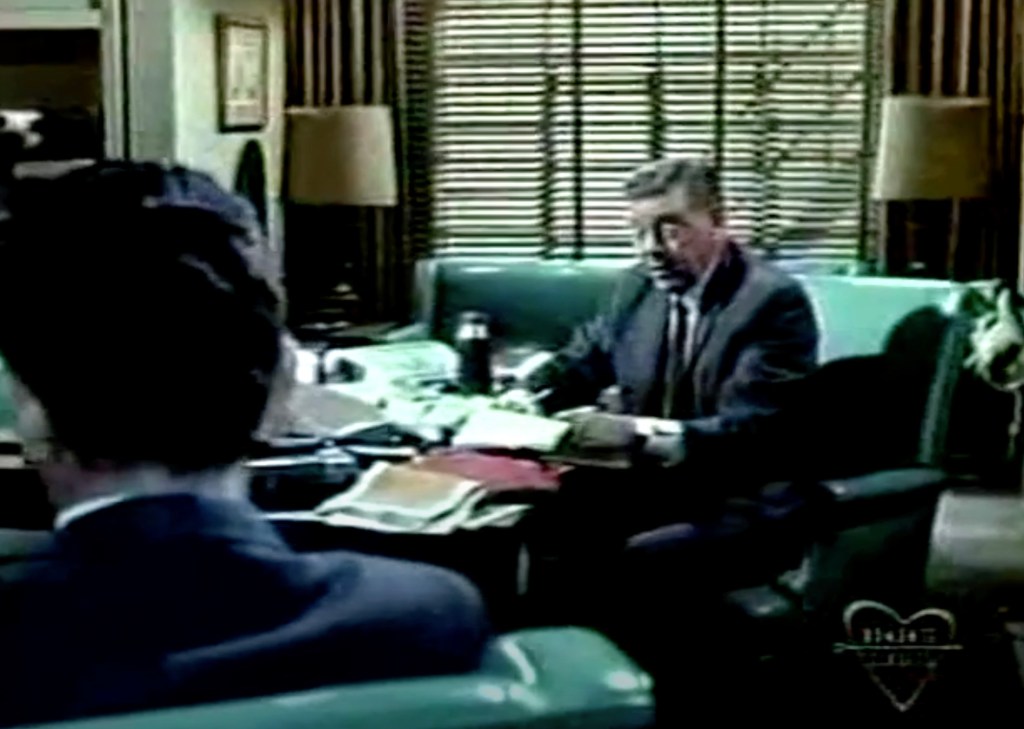 L’avocat prévient Leslie qu’il représente Elliot Carson dans l’affaire de la bagarre avec Jack Chandler. C’est la raison pour laquelle il est ici. Leslie essaie de donner une raison plausible à l’embauche de Chandler à la fabrique. Il avait été engagé comme ouvrier sur les docks. Steven demande à voir son dossier personnel et Leslie lui répond que Mlle Harris va le lui fournir.